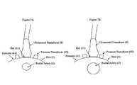 FIGS. 7A and 7B are cross-sectional views illustrating the effect of applying direct pressure while using various embodiments of the device. In particular, these figures show the augmentation of arterial pulsation during the same time periods of the cardiac cycle (veins not shown).
