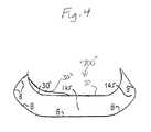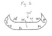 Such useful combinations include, but are not limited to, those combinations that include one or more features ofFIGS. 1-11 and: incorporate uppers that envelope the midsole and/or outsole and/or other features shown in published application '665 prior FIGS. 5-7 and 13; incorporate anthropomorphic shapes and/or chambers and/or other features shown in prior FIGS. 9 and 10; incorporate integral or insertable orthotics or microprocessor-controlled variable pressure and/or other features shown in prior FIG. 11; incorporate sipes and/or other features shown in prior FIG. 12; use uniform thickness (measured in frontal plane cross-sections) in rounded sole side or sole bottom portions, especially at essential support and stability elements and/or other features shown in prior FIGS. 14-16, 29-46 and 76-77; use increased or decreased (or variable) thickness in rounded sole side portions and/or other features shown in prior FIGS. 17-20, 24, and 27-28; use increased or decreased density or firmness in rounded sole side or bottom portions and/or other features shown in prior FIGS. 21-23 and 25-26; use rounding of the outer surface of the midsole on a sole side and/or other features shown in prior FIG. 43A; employ bent-in rounded sides and/or other features shown in prior FIG. 47; uses bulges with or without uniform thickness, at important support or propulsion areas and/or features shown in prior FIGS. 48 and 75; incorporates a flat heel (meaning no heel lift) and/or other features shown in prior FIGS. 51A-51E; incorporates negative heel embodiments and/or other features shown in prior FIGS. 49A-49D and 50A-50E; use rounded sides with variable thickness and firmness and/or other features shown in prior FIG. 52; employs sipes and/or other features shown in prior FIGS. 53-57, 70-71 and 73; incorporates fiber and/or multiple layers of chambers and/or other features shown in prior FIGS. 58-60; employ shoe soles or orthotics with sufficient width throughout or at specific portions to support a wearer's bone structures throughout a full range of motion and/or other features shown in prior FIGS. 61-65 and 72; uses relatively planar sides with rounded underfoot sole portions and/or other features shown in prior FIGS. 66 and 67; uses similarly shaped rounding on sole sides of different thickness at different parts of the sole and/or other features shown in prior FIG. 69; uses a variation of heel or forefoot lifts and/or other features shown in FIG. 74; and/or other features shown in prior FIGS. 78-82.