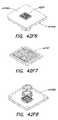 FIG. 75E depicts diagrammatically two microwells75E1 and75E2 being formed with such an extended floating gate structure. As will become clear in a moment, the structures ofFIG. 75E are in a partial state of completion. With reference toFIG. 75E, one possible sequence for fabricating the microwell structure with an extended gate electrode could be as follow: After forming the layer75E3 of material (e.g., TEOS) which will provide the microwell walls, on top of a CMOS wafer wherein the ISFET structures have been formed, the areas that will become the wells are etched down to the metal layer, labeled M4, constituting the floating gate of the ISFETs. (Or, alternatively, if as stated above the microwells are formed directly in the CMOS passivation layer, layer75E3 can be omitted and this and other passages referring to such a layer can be understood to refer instead to the passivation layer and formation of the microwells in the passivation layer, instead.) Next, using a process such as sputtering or ALD, a thin layer of metal (e.g., about 0.25-0.50 μm of aluminum, titanium, tantalum or other suitable material) is deposited to form a layer74E4 in contact with the M4 layer, running over the bottom of the well and up the sidewalls. The thin metal layer will also cover the tops of the (e.g., TEOS) material between the microwells, forming an electrical short circuit between the wells, which will have to be removed. Next, one may optionally fill the wells with a suitable material such as various organic fill materials that are readily available, to prevent the next step from leaving unwanted debris in the microwells. The next step is to employ CMP or another suitable technique to planarize the top of the structure down to a level that exposes the tops of the microwells and the material layer75E4 on the top of the sidewalls. Having thus exposed the metal layer75E4, that metal is removed from the tops of the microwell array (especially the tops of the sidewalls and TEOS between the sidewalls) in any satisfactory way). For example, the metal75E4′ at the top of the microwell structure (i.e., on the exterior top of the sidewalls) may be etched away or removed using metal CMP to further planarize the tops of the wells. Having removed the short circuit between the wells, the filler material, if used, is then removed. The extended gate metallization is then covered by application of the thin dielectric layer discussed above,75E5, such as a tantalum pentoxide (Ta2O5) ALD passivation, using ALD, for example. The dielectric/passivation must cover all edges of layer75E5 to avoid electrically short-circuiting wells via the analyte fluid.
