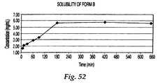 6.8.2.2 SolubilityA sample consisting of 449.4 mg Form A was slurried in dissolution medium. Particle size was not controlled. Aliquots were taken at 7, 15, 30, 60, 90, and 150 min. The concentration reached 6.0 mg/mL by the first time point. The highest concentration reached was 6.2 mg/mL, at 30 min. From that point the concentration decreased, reaching 4.7 mg/mL at 150 min as inFIG. 51. The solids remaining at the final time point were analyzed by XRPD and found to be Form E as shown in Table 7. No peaks attributed to Form A can be seen in the pattern. Since the concentration did not plateau at 4.7 mg/mL, the solubility of Form E may be lower than that.