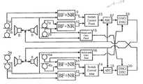 Similarly, themicrophones3aand3bare connected to the beamforming andnoise suppression unit12. Themicrophones4aand4bare connected to the beamforming andnoise suppression unit11. The beamforming andnoise suppression units12 and11 are located upstream of and connected to the detection andweighting unit14. The detection andweighting unit14 is disposed upstream of and is connected to theecho suppression unit18, the output of which is connected to the DVC/DEC unit20. The output of DVC/DEC unit20 is connected to a first input of the summingelement23.