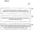 FIG. 7 shows anillustration700 of a method for processing trace data information according to various embodiments. The method may include thestep702 of storing trace data information relating to a series of instructions, in a chip with one or more memory circuits; thestep704 of providing off-chip access to the trace data information by a trace data information port; and thestep706 of controlling the transportation of trace data information from the one or more memory circuits to the trace data information port by a direct memory access controller circuit.