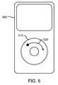 FIG. 5 is a block diagram of a user motion withmedia player500 for use with content scrolling in one embodiment according to the present invention. Referring toFIG. 5,media player500 includes auser interface wheel510. A user may interact withuser interface wheel510 to interact with content stored onmedia player500, and to perform one or more predetermined motions. In one embodiment, a predetermined motion can causemedia player500 to automatically scroll content. In another embodiment, a predetermined motion may causemedia player500 to quickly scroll through content as if a dial or knob has been quickly spun, or an object had been “flicked.” In order to create a “flick,” a user may pressuser interface wheel510 and quickly release after indicating a desired direction (shown by arrow520) along the rotational axis ofuser interface wheel510.