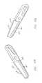 As best shown in the cross-section ofFIG. 5B, thethin cutting feature203 of thescissor blades131,133 realizes a cantilever spring arrangement by fixing itsbottom portion209 to theblade support201 with itstop portion211 angled or otherwise arranged to hold a bias along the length of the respective sharpened cutting edge (labeled151 inFIG. 5B) that will ensure that the cutting edge intersects the opposing blade's cutting edge in a scissor assembly. In this cantilever spring arrangement, thethin cutting feature203 acts as a resilient leaf-spring that allows for resilient deflection of thetop portion211 of thecutting feature203 relative to itsbottom portion209 being rigidly held and positioned by thethick blade support201. This allows one sharpenedcutting edge151 to forcibly engage with the opposing blade'scutting edge153 in a resilient and deflective manner so no gouging or wear damages the cutting edges. Such resilient deflection is depicted byvector arrow213 inFIG. 5B. The cantilever spring arrangement of thecutting feature203 extends along the length of thecutting feature203 such that the resilient deflection of thetop portion211 relative to itsbottom portion209 and theblade support201 is provided along the entire length of thecutting feature203. The cantilever spring arrangement of thecutting feature203 also provides a spring moment that is primarily directed across the cutting edge of thecutting feature203 laterally outward away from theblade support201 in the direction ofvector arrow215 as shown inFIG. 5B.