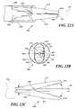 FIGS. 22A,22B,22C,22D and22E respectively illustrate a side view, a distal end view, a side view with jaw open, a side view with jaws open and the guidewire with eyes retracted, and a side view with jaws grasping tissue, for a first exemplary embodiment of forceps that are used with a guidewire with eyes;