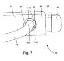 FIG. 6B is an enlarged view of the slidinglatch bar92.Keyhole94 has a roundedlobe95 disposed toward thetab96, and anovoid lobe97 opposite thetab96. Therounded lobe95 is sized to fit around theproximal end110 of the guide member16 (not shown). Theovoid lobe97 is sized to hold the attachment recesses114 of theguide member16. Thetab96 may be grasped to move the slidinglatch bar92 within thehorizontal slot89. A spring (not shown) is disposed in thehorizontal slot89 to provide resistance against the slidinglatch bar92.