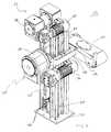In some embodiments,apparatus10 can further comprisearm drive assembly34 that can be configured to move up and downguide beam30.Arm drive assembly34 can comprisecarriage48 disposed aroundguide beam30.Carriage lift bar56 can be operatively attached to belt52 with means for attachingcarriage lift bar56 thereto. In the illustrated embodiment, the attaching means can compriseclamp plate54 clamped to belt52, whereincarriage lift bar56 is operatively attached tocarriage48 withpins58. Oncecarriage lift bar56 is clamped to belt52 withclamp plate54,carriage48 can move up or downguide beam30, guided byrollers40 travelling withinguide channels41, aslift drive assembly42 operates. It is obvious to those skilled in the art that ifbelt52 is replaced with a chain, for example, the attaching means can comprise one or more pins, or other functionally equivalent means, to attachlift bar56 to the chain.