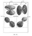 FIG. 37 shows the far field radiation pattern of the thin spiral antenna (0.5 inch thickness) at 30 MHz, mapped along threespatial dimensions3906,3908 and3910. Thepattern3902 represents trans-electric (TE) radiation pattern and thepattern3904 represents trans-magnetic (TM) radiation pattern. Thepatterns3902,3904 depict an equal amount of TE and TM energy being radiated towards zenith, orthogonal to each other. At the low end, the TM pattern (VPol)3904 can go down to the horizon whereas theTE pattern3902 may be zero on the horizon because of the ground plane. A complete wrap-around of energy at 30 MHz is seen because of relatively small dimension of the ground plane (30 inches across).