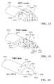 Further in some embodiments, one or both the pseudo-conductor and the fin may be tapered, for example, from a full width to about half-width over the length of the region under themicrostrip2612.FIG. 28A depicts a simplified perspective block diagraph view of a portion of aconformal antenna2810 in some embodiments, which is similar to theconformal antenna2610 ofFIG. 26. The conformal antenna comprises an electricallyconductive microstrip2612 positioned relative to afin2712 and apseudo-conductor strip2616.FIG. 28B shows an overhead view of thefin2712 and thepseudo-conductor strip2616 ofFIG. 28A. In this configuration, thefin2712 is tapered or mitered2812 as it extends toward themicrostrip2612 reducing the area of the fin most proximate themicrostrip2612. Similarly, thepseudo-conductor strip2616 is also tapered or mitered2814,2815 as it approaches thefin2712 andmicrostrip2616 establishing a partial gap proximate thefin2712. The mitering of the edges of thefin2712 and/orpseudo-conductor strip2616 can enhance matching. Thedielectric fins2712 can be selected, in some instances, to be the same thickness as the magnetic pseudo-conductor2616 and with a dielectric constant essentially equal to the permeability of pseudo-conductor. Thus, if the pseudo-conductor permeability is 80 then fins of permittivity of between about 60 to 90 can be utilized in many applications.