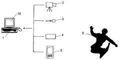 FIG. 1 shows an overall view of a system with which the inventive method can be performed. Acomputer1 is connected to acamera2 in order to record the motion of anathlete3. At the same time, metadata of said motion of saidathlete3 will be acquired, which has some significance for or in said motion. InFIG. 1, some examples of metadata andsensors4, with which additional information for saidvideo sequence11 is recorded, are given. Asensor4 can be e.g. amicrophone5 for simultaneously recording the sound track of saidvideo sequence11, an accelerometer, a force sensor/force plate, a speed sensor, a position sensor, including GPS, contact or contactless position sensor, including infrared ray, a human operated sensor, including computer,PDA6, a cell phone, a button, etc. It would furthermore be possible to add metadata to the acquiredvideo sequence11 during image analysis, when viewing and/or analyzing saidsequence11 in thecomputer1. This could as well include data from asecond camera2, which records the same motion from another viewpoint or angle. Any other trigger signal which can give a hint for a key position will be used in the inventive method.