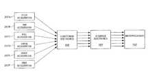 FIG. 14 schematically illustrates process methodology, according to the invention, which converts a plurality of acceleration inputs to speed. For example, when a plurality of six accelerometers (e.g., similar to the accelerometers202a-202dofFIG. 13) are connected to a microprocessor subsystem such as thesubsystem150 ofFIG. 10, the process methodology of the invention is preferably shown inFIG. 14. Specifically, six accelerometers are connected with various sensitive orientations to collect pitch207a, yaw207b, roll207c, surge207d, heave207e, and sway207faccelerations. These accelerations are conditioned by theconditioning electronics158′ through theinterface electronics156′ andCPU152′ to calculate speed, such as known to those skilled in the art of navigational engineering (for example, Gyroscopic Theory, Design, and Instrumentation by Wrigley et al., MIT Press (1969);Handbook of Measurement and Controlby Herceg et al, Schaevitz Engineering, Pensauker, N.J., Library of Congress 76-24971 (1976); and Inertial Navigation Systems by Broxmeyer, McGraw-Hill (1964) describe such calculations and are hereby incorporated herein by reference). Theelements158′,156′ and152′ are similar in construction to theelements158,156 and152 described in connection withFIG. 10.