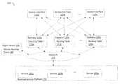 Gateways120a-ncan route service requests received at service interfaces110a-nfrom one or more requestors. Gateways120a-nand/or components (e.g., network servers) communicatively coupled to gateways120a-ncan provide service interfaces1100a-n. Routing tables125a-n, locally stored in gateways120a-n, respectively, are each a many-to-many mapping between service interfaces110a-nand a set of services155a-nprovided by abackend service platform150. Routing tables125a-ncan include VIPs associated with service interfaces110a-nas a high-level routing element to the set of services155a-n. Gateways120a-ncan use information stored in routing tables125a-nto determine state or status information associated with the set of services155a-n. For example, gateways120a-ncan receive connect requests, via service interfaces110a-n, and provide EPP greetings based at least in part on the VIPs of service interfaces110a-ntargeted by the requests. When responding to login and/or connect requests, gateways120a-ncan take into account the VIPs of service interfaces110a-ntargeted by the login and/or connect requests. Along with the requestors' IP addresses, login names, passwords, and digital certificates, gateways120a-ncan use the VIPs of the targeted service interfaces as a factor in making authorization or authentication decisions. For instance, gateways120a-ncan grant a request to access one or more backend services of services155a-nwhen the VIP of the service interface targeted by the request is listed in its routing table as authorized to access the one or more backend services.