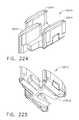 InFIGS. 207 and 208, theE-beam9102 is retracted with thetop pins9110 thereof residing within ananvil pocket9150 near the pivoting proximal end of theanvil9022. A downwardly open vertical anvil slot9152 (FIG. 203) laterally widens in theanvil9022 into an anvilinternal track9154 that captures thetop pins9110 of theE-beam9102 as they distally advance during firing, as depicted inFIGS. 210 and 211, affirmatively spacing theanvil9022 from thestaple channel9018. Thus, with theE-beam9102 retracted, the surgeon is able to repeatably open and close thestaple applying assembly9012 until satisfied with the placement and orientation of tissue captured therein for stapling and severing, yet the E-beam9102 assists in proper positioning of tissue even for astaple applying assembly9012 of reduced diameter and correspondingly reduced rigidity. InFIGS. 203,204,206,207,209, and215, thestaple applying assembly9012 is shown with thereplaceable staple cartridge9020 that includes thewedge sled9126. Longitudinally aligned and parallel plurality of downwardly open wedge slots9202 (FIG. 209) receiverespective wedges9204 integral to thewedge sled9126. InFIGS. 209-211, thewedge sled9126 thus cams upwardly a plurality ofstaple drivers9206 that are vertically slidable within staple driver recesses9208. In this illustrative version, eachstaple driver9206 includes two vertical prongs, each translating upwardly into arespective staple hole9210, orcavity9024, to upwardly force out and deform astaple9023 resting thereupon against a staple forming surface9214 (FIG. 211) of theanvil9022. A central firing recess9216 (FIG. 204) defined within thestaple cartridge9020 proximate to thestaple channel9018 allows the passage of the bottom, horizontal portion9218 (FIG. 206) of thewedge sled9126 as well as themiddle pins9112 of theE-beam9102. Specifically, a staple cartridge tray9220 (FIGS. 204,209) attaches to and underlies a polymerstaple cartridge body9222 that has the staple driver recesses9208, staple holes9210, andcentral firing recess9216 formed therein. Asstaples9023 are thus formed to either side, thesharp cutting edge9116 enters a vertical throughslot9230 passing through the longitudinal axis of thestaple cartridge9020, excepting only a most distal end thereof.