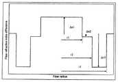 Moreover, for optical fibers, the refractive-index profile is generally classified according to the graphical appearance of the function associating the refractive index with the radius of the optical fiber. Conventionally, the distance r to the center of the optical fiber is shown on the x axis, and the difference between the refractive index (at radius r) and the refractive index of the optical fiber's outer cladding (e.g., an outer optical cladding) is shown on the y axis. The outer cladding, functioning as an optical cladding, typically has a refractive index that is substantially constant. This outer cladding is typically made of pure silica but may also contain one or more dopants.