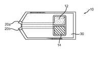 InFIG. 1B, an ink containing conductive carbon and a binder was then applied by screen printing in apattern22 and24 to form the top layer of each electrode, areagent layer26 and28 of glucose oxidase (or PQQ-GDH glucose dehydrogenase) and ferricyanide as a mediator. The working andcounter electrodes12 and14 had surfaces of 1 mm and 1.2 mm2, respectively, and the electrodes were separated by about 0.25 mm. InFIG. 2A, adielectric layer30 containing acrylate-modified polyurethane was deposited onto the base. The lower layers of the electrodes then were cured with UV radiation.