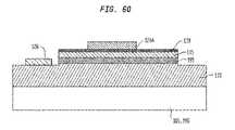 FIG. 36 is a cross-sectional view of a substrate having a buffer layer, a mesa-etched complex GaN heterostructure, metallization forming an ohmic contact with the p+ GaN layer, metallization forming vias, lateral etched trenches, and passivation layers (such as silicon nitride).
