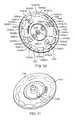 FIG. 39 illustrates a stationary-magnet-element disc drive3900 that can be used in a rotary-type monitoring/measuring system/unit of the present disclosure, such as in the place of the stepper motor arrangement illustrated inFIG. 22. Referring toFIG. 39,disc drive3900 includes a plurality of magnetically switchable magnet elements3904 (only a handful labeled for convenience (e.g., electromagnets, rotatable magnets, magnets having movable magnetic shields, etc.) that are individually switchable to change polarity, to change the location of the poles, and/or to change the magnetic state (e.g., from non-polarized to polarized). Eachmagnetic element3904 is located at a fixed location (i.e., stationary (note that the magnetic element could be moveable in place in some embodiments) on a monitoring/measuring unit3908 and is capable of magnetically coupling with adisc3912, such as a chemical indicator disc or an ambient light analysis disc, that includes one or more corresponding magnets, here magnets3916(1) to3916(4). As those skilled in the art can readily appreciate,monitoring unit3908 can include asuitable controller3920 that is configured, for example, via software and/or hardware, to control the states ofmagnetic elements3904 so that their interaction with magnets3916(1) to3916(4) causesdisc3912 to rotate about its centralrotational axis3924. The number and arrangement of the magnetic elements, as well as the switching scheme implemented, can be varied to achieve the desired number of steps in a full revolution ofdisc3912. In one example, the arrangement and controlling of the magnetic elements could be executed to create the small incremental steps described above in connection with the multi-reading scheme ofFIG. 25.