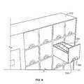 Turning now toFIG. 20, there is shownmodular shelf units1000 which can be used in connection with a hair dye system. Themodular shelf units1000 include a plurality ofshelf openings1050 to accommodatereceptacles1100 that slide outwardly towards the user to open. Thereceptacles1100 include a glide orchannel1150 that receives opposingpins1170 that protrude from the front of the openings. Thechannel1150 includes acurved section1200 near the back region of the receptacle. Thecurved section1200 curves such that anend1250 of thechannel1150 is positioned near the back lower region of the receptacle. Thus when the receptacle is pulled out, it can swing or pivot downwardly. The drawer can havevarious sections1300,1320 to help organize and sort the product placed therein.