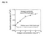 FIG. 15 depicts swelling of a hydrogel in response to increasing concentrations of antigen (taken from Miyata et al, Ibid.). The X-axis illustrates an equilibrium swelling ratio of a hydrogel containing antigen-antibody complexes, while the Y-axis depicts free antigen concentration.FIG. 15 also illustrates a comparison between a semi-interpenetrating network (IPN) hydrogel containing an antigen-antibody cognate pair and a control polyacrylamide (PAAm) semi-IPN hydrogel without antigen-antibody at increasing concentrations of free antigen. Swelling was measured in microns cubed. See Miyata et al, Ibid.