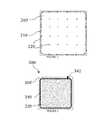 The first andsecond lamp substrates200 are preferably hermetically sealed together, and cooperatively define aninternal chamber102. The first and second lamp substrates are preferably sealed together by glass frit210, but can alternatively be sealed in any suitable manner. The distance between the first andsecond lamp substrates200 is preferably substantially uniform, and is preferably maintained byspacers220. This distance is approximately 1.1 mm, but can alternatively be larger or smaller. The distance is preferably maintained by spherical spacers, wherein thespacers220 preferably have a diameter substantially similar to the desired separation distance (e.g. 1.1 mm, 0.5 mm, etc.). However, rectangular prismatic, cylindrical, or any other suitable spacer can be used. Alternatively, the spacing may be accomplished by molding the back glass substrate with pre-formed spacers (e.g. bumps) that maintain the spacing between the front and back glass. Thespacers220 are preferably glass, more preferably the same glass as thelamp substrates200, but can be any suitable material. Thespacers220 are preferably evenly distributed over the active area of the lamp100 (e.g. across the broad face of the first and second lamp substrates200), but can alternatively be confined to the lamp/lamp substrate perimeter. As shown inFIG. 2, thespacers220 are preferably distributed in a grid pattern, but can alternatively be distributed in any other suitable pattern. In one variation, thespacers220 are placed approximately 0.5 inches-1.5 inches (12.7 mm-38.1 mm) apart. The spacer positions are preferably retained by one of the internal phosphor coatings400, but can alternatively be retained by glass frit, friction between the spacer and thelamp substrate200, or by any other suitable mechanism. Thelamp substrates200 are preferably joined by aglass frit210 about the lamp substrate perimeters, but can be otherwise hermetically sealed.