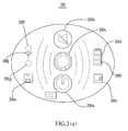 FIG. 3(e) illustrates anexemplary control panel38 ofmodule configuration37. Theexemplary control panel38 preferably includes, for example, apower switch38afor powering and/or de-powering themodule configuration37 after it has been plugged into the conventional wall outlet or equipped with a charged battery back-up subsystem. In addition, thecontrol panel38 preferably includes analarm switch38bwhich allows a user to mute and/or de-mute an audible alarm (for example, a conventional buzzer, not shown) which is coupled to an alarm circuit (not shown) that is configured to issue an alarm when A/C power to themodule configuration37 has been interrupted and/or when other medical device or remote monitoring system-level alarms occur. Thecontrol panel38 also includes an A/C power indicator38cwhich may preferably be provided as one or more light-emitting diode (LED) indicator segments which are activated when A/C power has been provided to themodule configuration37. Optionally, theindicator38cmay be intermittently activated when A/C power is lost (for example, by means of back-up battery power) to signal the loss of A/C power.