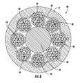 In various embodiments,film28 is positioned relative to the wrapped pattern ofcore26 to restrain the core26 from unwinding or unwrapping during cable construction. For example, in one embodiment (as shown inFIG. 8),film28 is applied to the outer surface ofcore26 immediately after the core elements are wrapped aroundcentral strength member24 in the desired pattern. In this arrangement,film28 holds the wrappedcore26 in the desired wrapped pattern as additional cable components (e.g.,armor30, and/or jacket12) are applied overcore26. In another embodiment,core26 is an optical communication bundle in which the outer surface offilm28 defines the outermost surface of the communication bundle. In such embodiments,core26 does not include outer layers such asjacket12.