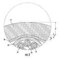 Referring toFIG. 4, a detailed view of one of the opticaltransmission core elements48 is shown according to an exemplary embodiment. As shown, each core element includesoptical fibers18 located within abore50 defined byinner surface52 ofbuffer tube20.Buffer tube20 also includes anouter surface54 that is in contact withfilm28 as discussed above. In the embodiment shown, each core element includes twelveoptical fibers18, and in this arrangement three of the twelve optical fibers are located in a central area ofbore50, and nine of the twelve are located around the inner three fibers and at least some of the outer nine fibers haveouter surfaces56 that engageinner surface52 ofbuffer tube20. In various embodiments,core element48 includes at least nineoptical fibers18 located withinbuffer tube20. In other embodiments,core element48 ofcable40 includes 2, 4, 6, 8, 12, 24, 36 or moreoptical fibers18.