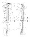 As thecartridge carrier126 and theplunger carrier138 move in the distal direction, the components move from the position shown inFIG. 10B to the position shown in10c. As shown inFIG. 10C, at the position wherein theneedle58 has been inserted into the target tissue, thechannels152 again align with therecesses156 in theguides158. As a result, thetransfer instruments150 are able to move freely between the plunger carrier recesses154, thechannels152, and the guide recesses156. Thetransfer instruments150 may be in the “out” position (i.e., in the guide recesses156) or in the “in” position (i.e., in the plunger carrier recesses154). As thecartridge carrier126 is moved into the furthest distal position as illustrated inFIGS. 13A and 13B, however, theplunger carrier138 continues forward movement as a result of the rotation of thedrive screw114. With continued motion of theplunger carrier138, thetransfer instruments150 ride along ramped edges of therecesses154 of theplunger carrier138, urging thetransfer instruments150 outward through thechannels152 in thestationary cartridge carrier126 and toward therecesses156 in theguides158. In this way, the continued motion of theplunger carrier138 causes thetransfer instruments150 to ride along the ramped sides of therecesses154 of theplunger carrier138 to move outward when thechannels152 of thecartridge carrier126 are aligned with therecesses156 of theguide158, disengaging thetransfer instruments150 from therecesses154 in theplunger carrier138 to engage thetransfer instruments150 in therecesses156 in theguide158, that is, the position illustrated inFIG. 10D. In the position ofFIG. 10D, theplunger carrier138 is free to continue forward movement for drug delivery.