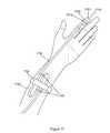 FIG. 17 shows an alternative implementation where the user attaches asensor unit1701 without the sensor housing. In this implementation, the sensor unit is not embedded within the sensor housing. Instead, it is left exposed on all sides. Using the sensor unit without the sensor housing may be more appropriate in certain trauma situations where use of the sensor housing is contraindicated. Separate material, not coupled to the sensor unit, is used to create a sensor housing to secure the sensor unit. In this example, afinger glove1705 secures the sensor unit on a patient'sfingertip1710. Aring1715 on the finger glove is cut to reduce constriction.Cable1718 runs along a patient's forearm1720. The cable attaches to the forearm with astrap1725.Ties1730 provide additional strain-relief for the cable.