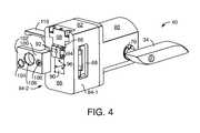 FIG. 4 shows an embodiment of the clampingassembly60 having abody80 coupled to anend housing82. Thepost70 joins thelever34 to one side (called herein the front side) of thebody80. Theend housing82 has opposing sidewalls84-1,84-2 (generally,84) spatially separated by aback wall86. The sidewall84-2 is not visible; the reference numeral points generally to the area of the side wall84-2. Sidewall84-1 has the slot68 (FIG. 3) that is adapted to receive the microfluidic cartridge16 (FIG. 1). Sidewall84-2 has a corresponding slot (not shown) aligned with theslot68 in the sidewall84-1 such that themicrofluidic cartridge16 passes through both slots upon being installed into the clampingassembly60.