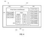 The first and secondvirtual devices404 and406 are the top level of a three level hierarchy representative of each of the devices in the system. In general, each of the virtual devices in an AV node structure is representative of functional units within a device. The firstvirtual device404 includes anobject408 representative of the second hierarchical level. As detailed later, objects may be used to represent processing blocks, control elements, status elements, etc. Theobject408 may have additional components including are afirst object410 and asecond object412. The first andsecond objects410 and412 represent additional functional elements within theobject408. Objects may represent data that defines an equalizer or, pertinent to the present disclosure, that may define the routing of audio between AV devices. Each AV object defines specific attributes of the AV architecture and may contain one or more state variables (SVs).