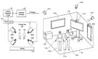 The components of the motion tracking system of an embodiment include sensors, tags, computing hardware, and software, but may not be so limited.FIG. 1B is a block diagram of the motion tracking system, under an embodiment. The motion tracking system operates in aworkspace environment100 occupied byusers200 having taggedwands300 and/or tagged gloves310, and using applications rendered on fixed screens400 andmobile screens410. Tag sensing is provided by fixed cameras mounted within the workspace500 and attached to screens510, while computing hardware andsoftware600 runs the sensing algorithms and user applications.
