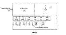 FIGS. 4A-4E depict examples of schematics of frames in a video clip corresponding to positions of a playhead. In the examples shown, the playhead is moved horizontally acrossthumbnail number2 inthumbnail group number3. As the playhead is moved from the left of the thumbnail (playhead position1) to the right of the thumbnail (playhead position5), frames corresponding to the positions of the playhead are displayed in thepreview pane115. The rate at which frames are updated in thepreview pane115 corresponds to a play speed. The play speed input is provided by the user. In some implementations, a user, using a mouse as a pointing device, can move the mouse horizontally across the one ormore thumbnails205. The play speed corresponds to the speed with which the user moves the pointing device. In other implementations, the system can have one or more designated play speeds which the user can choose. Scrubbing refers to previewing the contents of one ormore thumbnails205 by moving the cursor over thethumbnail205 in thethumbnail group203 in forward or reverse directions. The contents of athumbnail205 can be scrubbed by a simple mouse over operation that does not require clicking the mouse on thethumbnail205 to preview a frame in thepreview pane115. The time line representing progression a of video clip runs from left to right. Therefore, moving the playhead from left to right displays the frames corresponding to the position of the playhead in thepreview pane115 in the sequence in which the frames were recorded. Similarly, moving the playhead from right to left displays the frames corresponding to the position of the playhead in thepreview pane115 in the sequence opposite to that in which the frames were recorded. A user may move the playhead at a play speed placed over athumbnail205 using the pointing device either from the left to the right or the right to the left or both to scrub the contents of thethumbnail205 in thepreview pane115. When the user ceases to move the mouse, play speed input is stopped, and scrubbing is ceased.