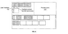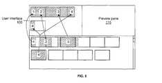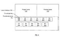 The vertical and horizontal dimensions of thethumbnails205 are uniform and are designated by the system. The dimensions of themedia pane105 and theproject pane110 may be insufficient to display all the thumbnails405 related to one ormore thumbnail groups203 in the same row. In some implementations, an interactive scale is displayed adjacent to themedia pane105 and theproject pane110. The scale is operatively coupled to the dimensions of the thumbnails in themedia pane105 and theproject pane110. A user can change the position of the scale to increase or decrease the size of thethumbnails205 in themedia pane105 and theproject pane110. In this manner, the size of thethumbnails205 displayed in themedia pane105 and theproject pane110 can be simultaneously altered. In other implementations, the size of themedia pane105 is automatically increased to accommodate allthumbnails205 by adding rows. Nevertheless, the dimensions of themedia pane105 displayed remain unaltered. A vertical scroll bar is incorporated into themedia pane105 so that the user may scroll vertically to accessvideo clips200 that are not immediately viewed. In other implementations, the user can pan themedia pane105 using the pointing device or the keyboard or both. The size of display of thethumbnails205 can also be altered by a combination of resizing thumbnails using an interactive scale and increasing the size of themedia pane105.