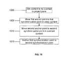 FIG. 10 depicts an example of a flow chart of a method of synchronizing overlay content to video content. The overlay content is overlaid on the video content displayed in theproject pane110. Based on user input, the content to be overlaid is added to theproject pane110 at1000. The overlay content includes one or more of audio tracks, voice-overs, titles, transitions between video, and combinations of the three. In some implementations, the overlay content is displayed in theproject pane110 as a horizontal bar in the gutter between rows ofthumbnail groups203 representing video content. The user can synchronize a first point in the overlay content to play back whenever a second point in the video content is played back. In some implementations, the user picks a first point on athumbnail205. The user then adds the overlay content. The starting point of the overlay content is automatically anchored to the first point in the thumbnail. In other implementations, the user adds the overlay content to a thumbnail in theproject pane110. The starting point of the overlay content is automatically anchored to the starting point of the thumbnail to which the overlay content is added. The anchor is displayed as two points, each located on the video content and the overlay content, connected by a vertical line. Based on user input, the first anchor point is moved to a first synchronization point at1005. Similarly, based on user input, the second anchor point in the overlay content is moved to a second synchronization point at1010. The first synchronization point is anchored to the second synchronization point at1015. Once anchored, the second synchronization point in the overlay content always plays back at the same time as the first synchronization point in the video content to which it is anchored, regardless of additions to or deletions from the video content and the overlay content. The anchor points on the video content and the overlay content can be moved using the pointing device or the key board or both.