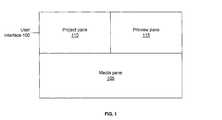 In some implementations, the width of themedia pane105 is equal to the sum of the widths of theproject pane110 and thepreview pane115. The height of the three panes can be equal to one another. A user can alter the dimensions of the panes within the limits of the dimensions of a display device on which theuser interface100 is displayed. The dimensions of theuser interface100 can also be altered within the limits of the display device causing the dimensions of the panes to change proportionally.