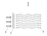 FIG. 11E illustrates a desiccant cooling system in the prior art. A stack ofplates1134 is placed (typically about 0.25 inch apart) and is covered by amembrane1131 that haswater1133 flowing behind it. The opposite site of the plate contains asecond membrane1135 behind which a liquid desiccant is flowing.Incoming air1136 is dehumidified because water vapor in the air is absorbed into the liquid desiccant through themembrane1135. At the exit of the plates, the dehumidifiedair1137 is partially directed towards the space being cooled and a portion is directed in thereverse direction1138. Thissecondary air flow1138 is relatively dry and can effectively absorb water vapor from thewater1132 behind themembrane1135. The absorption of water vapor through the membrane into the air leads to a cooling effect of the diverted air. This cool air in turn cools thewater1133. The cool water then thermally cools the plates as well as the liquid desiccant which ultimately leads to the main air stream being cooled. This approach allows evaporative cooling to occur in climates such as Miami, Fla. where humidity levels and temperatures are relatively high so that cooling towers normally do not function as well. By first drying the incoming air and then using indirect evaporative cooling through the membrane, the system is able to use evaporation to create a cooling effect. To inhibit the secondary air from mixing with the outdoor air, it is diverted bydiverter1139 near the end of the plate stack in adirection1140 perpendicular to the drawing. As can be seen in the figure, the membrane/liquid layers are mirrored—water is facing water and desiccant needs to face desiccant for each of the plates. This creates a challenge for manufacturing such a plate stack.