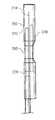 Deployment of asecond stent232 is described with reference toFIGS. 3A-3E, which deployment method may be used to deploy further stents as well, in a serial manner without having to remove and “reload” a deployment apparatus.FIG. 3A shows the deployedfirst stent230 as inFIG. 2E, with the catheter having been rotated so that thestent deployment lumen204 is no longer aligned with thefirst stent230. Next, as shown inFIG. 3B, thecatheter200 is again advanced along thewire guide210 so that a distal end length thereof traverses thestricture285. Asecond stent232 is advanced through thestent lumen204 by thestent pusher228 until—within the confines of thestent lumen204—thesecond stent232 also traverses thestricture285, as shown inFIG. 3C.
