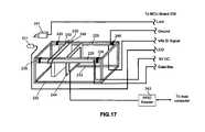 FIG. 11 is a schematic top view showing the manner in which a plurality of file folder circuits can be physically arranged in a single file drawer. As seen in this FIG., each folder circuit161i-165iis electrically coupled across conductive support rails128,129 with all circuits connected in parallel.Current detector circuit139 has a first node coupled torail129 and a second node coupled tomicrocomputer unit145 ofFIG. 9.Choke coil138 is coupled betweenrail128 and the associated one of the power output terminals ofD.C. power switch148.Capacitor137 is coupled betweenrail128 and the associated one of the R.F. output terminals of R.F. switch147.