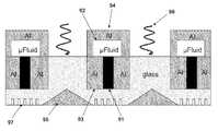 In various embodiments, a top-side flood illumination method is used as shown inFIG. 10. The fluidics channels and ZMWs are optically shielded from topside illumination and a path to direct the light to the active area of the ZMWs is provided. The top half of the exemplary ATE socket is transparent to the flood illumination while shielding the microfluidic insert. The socket may be made of a waveguiding material to assist the flood illumination of the part. For example, the socket may include a structure or materials selected to guide the flood illumination along a predetermined path. InFIG. 10 the optode array chip comprises an array ofZMWs91 formed within a transparent substrate such as glass. Surrounding the ZMWs and extending into the top surface of the glass substrate are regions of opaque cladding material, comprising, for example, a metal such as aluminum.Illumination light96 introduced from above the chip passes down through the glass and is directed upward to the bottom of the ZMWs byoptical elements95, which can comprise mirrors or dielectric stacks. The light can stimulate emission from sample within the ZMW, the emitted light from which is transmitted down tooptical detectors97. Fluid is transported to the ZMWs byfluid conduits92. The tops of the ZMWs are covered with an opticallyopaque covering94 which prevents the illumination light from entering the ZMW from above. Theopaque covering94 can comprise a metal such as aluminum.