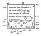 In such an embodiment, when a student says a word incorrectly (or exhibits some other behavior of interest), however, the teacher taps the word inarea432 which causes the word to be placed in a highlightedarea435 withinticker area432. This also causes the selected word to be displayed inlens area436.Freehand area438 may then be used by the teacher to make a note about the error (e.g., writing the word the student mistakenly substituted for the highlighted word actually in the book's text). In an embodiment, these notes are taken in freehand thereby eliminating the need to use Graffiti. At any time during this process,clear control button439bmay be tapped to clear any freehand text placed inarea438 by the teacher in error.