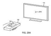 FIGS. 29A and 29B depict an example of 2D gesture input in free space. If user touches the surface oftouchpad106, then a “bubble”icon2900 can be displayed when in gesture mode. When user subsequently moves the remote controller in free space, the bubble trajectory can be traced on TV display. The gesture recognition application program at the host TV side can be developed to correctly identify a uni-stroke character2902 (e.g., a single alphanumeric character). If the gesture recognition program can successfully identify the character, then the program can display a solidcolored trajectory2904 to indicate the successful result to the user. This gesture input feature can also be expanded to 3D gestures.FIGS. 30A and 30B depict how to generate 3D likebubble trajectory3000,3002 in 3D space by movement ofremote controller100 in X-Z plane.