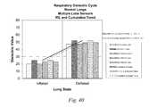 FIG. 43 is a chart illustrating the ability of the present invention to track and trend the dielectric behavior of each lobe of each lung simultaneously. As illustrated, the present invention generates a trend index for each lobe such that the progression of congestion in each lobe may be monitored and used as part of the clinical evaluation of a patient. For example, the present invention supports the incorporation of alarms where the congestion might present in any of the five lobes. Each of the dielectric progression curves may be consulted and readings from eachsensor20 for each lobe may be compared against their respective dielectric progression curves. For example, in the case where a subject may be experience some level of congestion in a left lower lobe LLL but not in the right lower lobe RLL, a physician may elect to delay treatment since there is only evidence of congestion in the left lower lobe. Consequently, if only onesensor20 were used on the left lower lobe LLL, and the readings indicated a progression toward congestion, more drastic action might be taken to seek help to address the congestion.