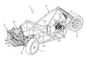 Other features of the vehicle are shown inFIG. 21. For example, thebattery470 is shown behind the passenger's seat to account for a heavier driver, or the absence of a passenger, to equalize the center of gravity. Also themuffler472 is positioned in the front of the vehicle, but projected rearwardly and downwardly.