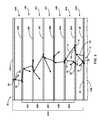 The example beta particle paths described above with respect tobeta flux vectors64,66,68,70,72,74,76,78,80,82,84,86, and88 are merely illustrative of a possible path for beta particles throughpower converter50. For example, although only a singlebeta flux vector64 is shown being emitted in a single direction frombeta emitter12, beta particles may actually be emitted frombeta emitter12 in all directions such that an infinite number of beta flux vectors could have been shown, each encountering transitions between moderatinglayer54A and high-density layer56A at any one of an infinite number of points along the interface between moderatinglayer54A and high-density layer56A. Moreover, although each backscattering event only shows a beta flux vector being “split” into two resulting beta flux vectors, in reality beta particles may be backscattered back or continue through the interface in an infinite number of ways. For example, althoughbeta flux vector74 is shown inFIG. 3 as splitting intobeta flux vector80 that is backscattered intosemiconductor substrate18A andbeta flux vector82 that continues into high-density layer56A, an infinite number of backscatter beta flux vectors or continuing beta flux vectors are possible.