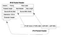 Step408 may include adding other header data from the IPv4 packet to the IPv6 header. One example may be to copy Quality of Service data from the IPv4 header to the IPv6 header. One example of such data may include a Differentiate Services (DS) Field, which may be defined for both IPv4 and IPv6 protocols in IETF publication RFC 2474. The DS field may include a Data Services Code Point (DSCP) field. In various examples, the IPv4 packet may include the DS field in the Type of Service (TOS) location, which may be the second byte of the header (not shown). The entire DS field, or a portion thereof (e.g., the DSCP field), may be copied and included in the IPv6 packet header. In various examples, the copied field may be included in the Priority (i.e., Traffic Class) field in the IPv6 header illustrated inFIG. 3.