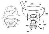 FIG. 9 illustrates an alternative embodiment as described above wherein the weighting-port cover902 screws into the body. In this embodiment, thecover902 includes a substantially curved threadedouter perimeter904. Aweight906 attached to an inner portion of thecover902 is shown in phantom.Reference numeral908 is a seal, as has been described. Theelements902,904,906 and908 comprise an assembly.