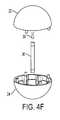FIGS. 4D,4E, and4F (an exploded view without O-ring26) further illustrateimplant20 having abio-absorbable tube36 mounted ontocentral posts32 on eachimplant half22,24.Tube36 can help to hold the two halves together, however, it may also be used to supportimaging element38. In this case,imaging element38 is a surgical clip or other implantable grade x-ray visible bio-compatible material (such as stainless steel or titanium). Theimaging element38 is also located at the geometric center of theimplant20. In this way, by knowing the geometry of the implant (a sphere of a given radius in this example), and knowing the location of the geometric center of the implant (determinable from the imaged location of the imaging element38), the location of the implant surface (and thus the surface of the tissue surrounding the implant) can be determined, or corroborated with other measurements. Also, the centrally located imaging element can serve as the isocenter for the target, a useful term for tracking the location of the target tissue. As an alternative to aseparate tube36, an integral material segment (not shown) may extend from the internal surface of the hemisphere to create a hollow region at the geometric center of the device for theimaging element38 to reside.