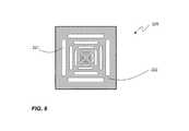 FIG. 6 shows another embodiment of a planar mode-0 2-D TW radiator225, which may be preferred in certain applications over the planar multi-arm self-complementary spiral as aTW radiator125. It consists of an array ofslots221, which is an array of concentric subarrays of slots; each subarray of four slots is equivalent to an annular slot. The hatchedregion222 is a conducting surface that supports the slots.FIGS. 7A-7B and8A-8D show additional embodiments of the 2-D TW radiators125.FIG. 7A shows a 2-D TW radiator325 having an array ofslots321 and a conducting surface332 as the hatched region. Additionally,FIG. 7B shows a 2-D TW radiator425 having an array ofslots421 and a conductingsurface422 as the hatched region. In addition,FIGS. 8A-8D show additional embodiments of the 2-D TW radiators525,625,725, and825, respectively. While most of the 2-D TW radiator125, and thus theTW structure120, are symmetrical about a center axis of the antenna, they can be reconfigured to have an elongated shape in order to conform to certain platforms. These configurations provide additional diversity to the 2-D surface-mode TW radiator125 capable of ultra-wide bandwidth and other unique features desired in certain applications.