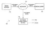 Although monitoringdevice106 is shown inFIG. 1 as an external monitoring device, in somecases monitoring device106 may be incorporated into an “in-line” device betweenmedia server102 andmedia client104. For example,monitoring device106 may be a router or deep-packet inspection device, or a module incorporated into a router or deep-packet inspection device.